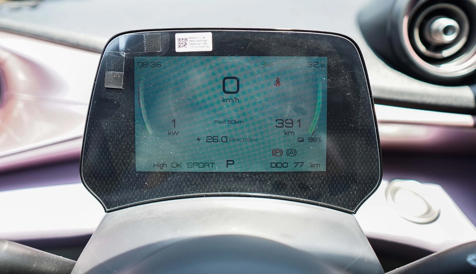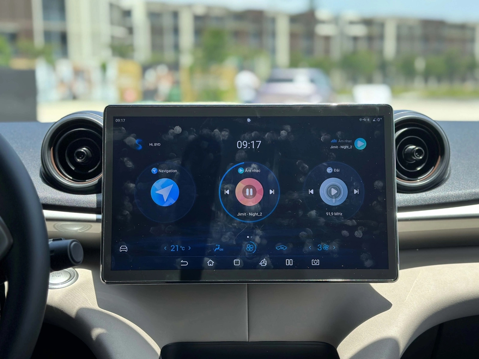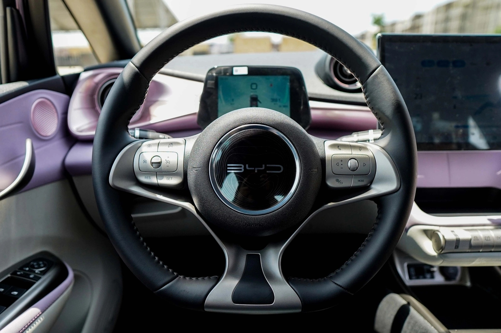 Vô-lăng của BYD Dolphin bọc da, trợ lực điện. Phía sau là màn hình tốc độ 5 inch. Xe có hỗ trợ điều khiển bằng giọng nói nhưng chỉ có tiếng Anh. Điều hòa tự động một vùng kèm bộ lọc bụi mịn.